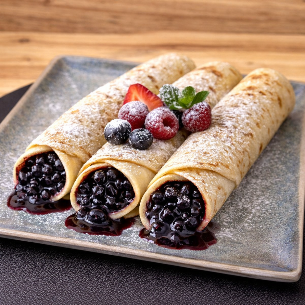 Clătite proaspete, fragede și umplute cu dulceață aromată de afine, perfecte pentru deserturi la evenimente sau gustări dulci.