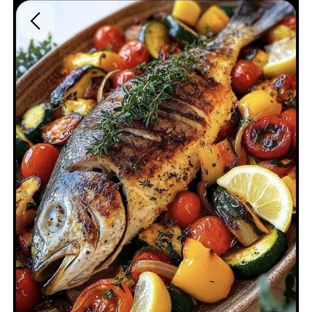 Dorada întreagă, coaptă la cuptor cu ierburi aromatice și condimente, pentru un preparat cu textură delicată și aromă autentică. Ideală pentru mese ușoare și elegante.