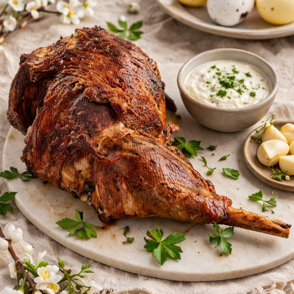 Friptură de miel fragedă, gătită lent și asezonată cu condimente simple, pentru un gust autentic și suculent, perfect pentru masa de Paște.