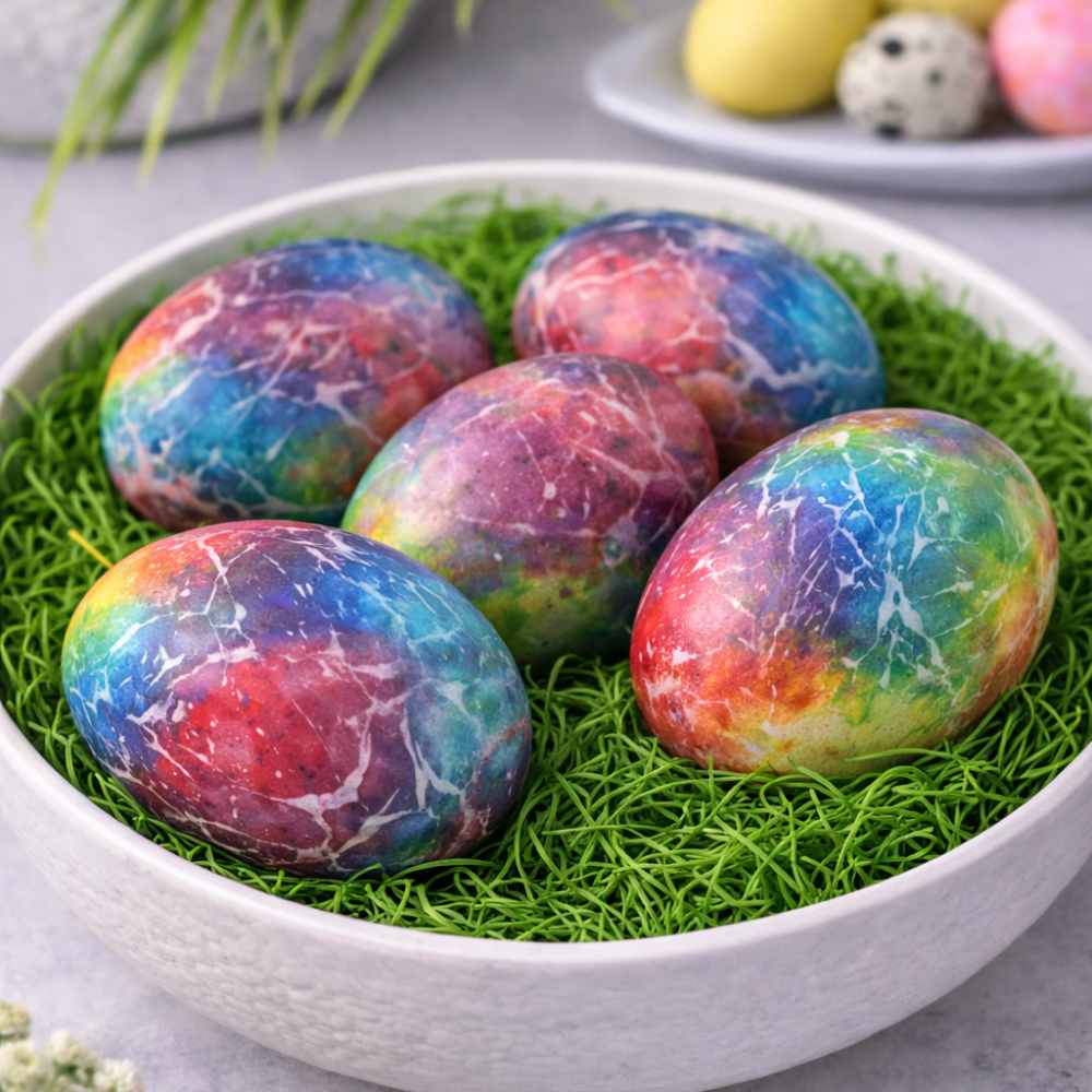 Ouă colorate, simbol al sărbătorii de Paște, pregătite cu grijă pentru a aduce culoare și bucurie pe masa ta. Un detaliu tradițional care completează perfect meniul festiv.