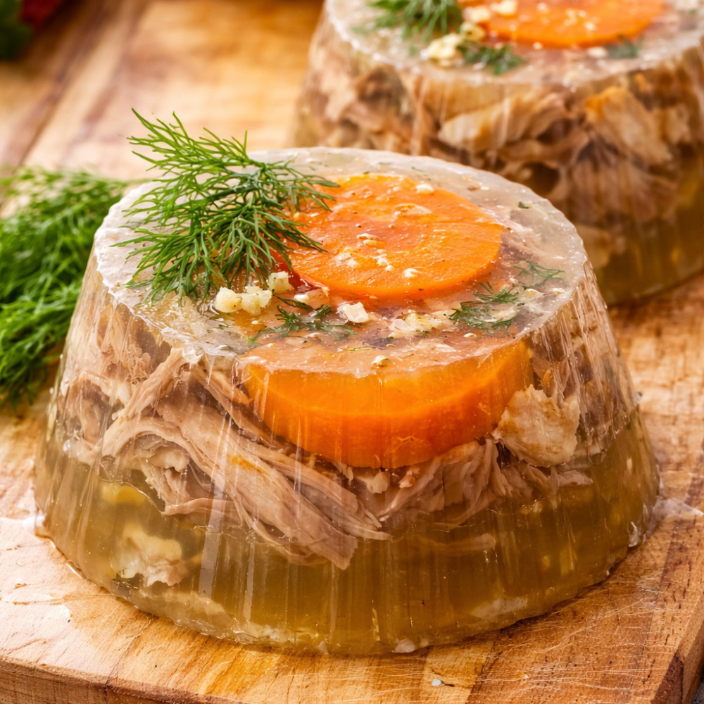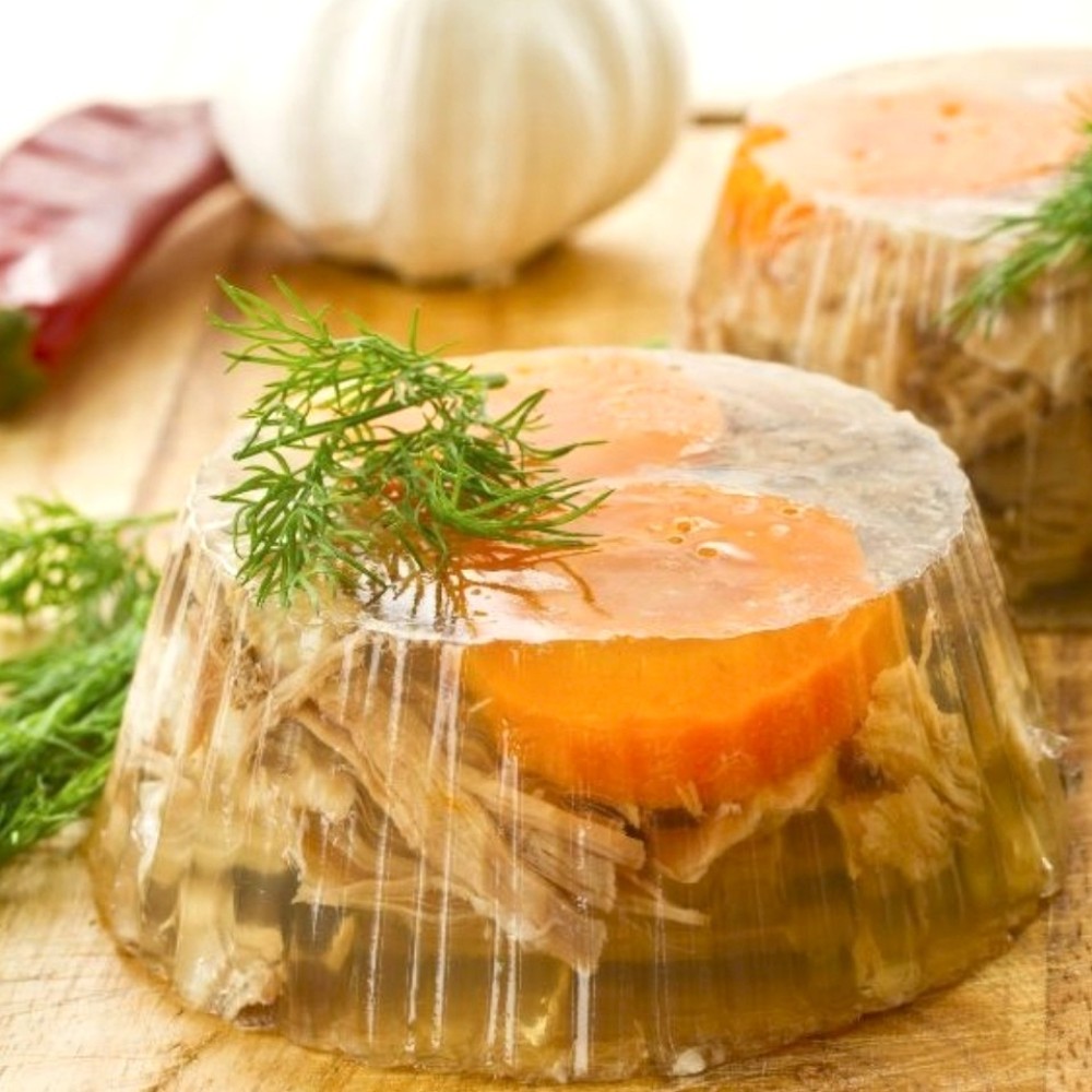 Carne fragedă de curcan, asezonată cu usturoi și condimente alese, într-o gelatină limpede și aromată. Un preparat clasic, ideal pentru mesele de sărbătoare sau pentru cei care apreciază gustul autentic românesc.