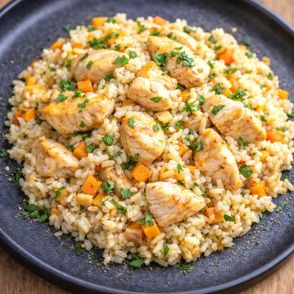 Pilaful cu piept de pui combină orez pufos cu carne fragedă de pui și legume atent alese, pentru un gust echilibrat și reconfortant. Ideal pentru mesele de zi cu zi sau prânzuri rapide și consistente.