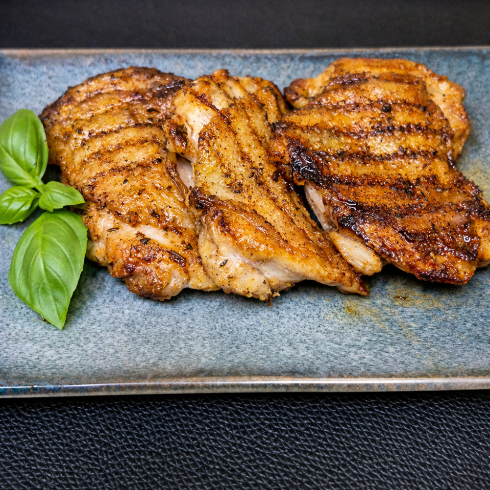 Pulpe de pui dezosate, gătite la grătar pentru un gust bogat și o textură perfectă. Ideal pentru prânzuri rapide sau mese în familie.