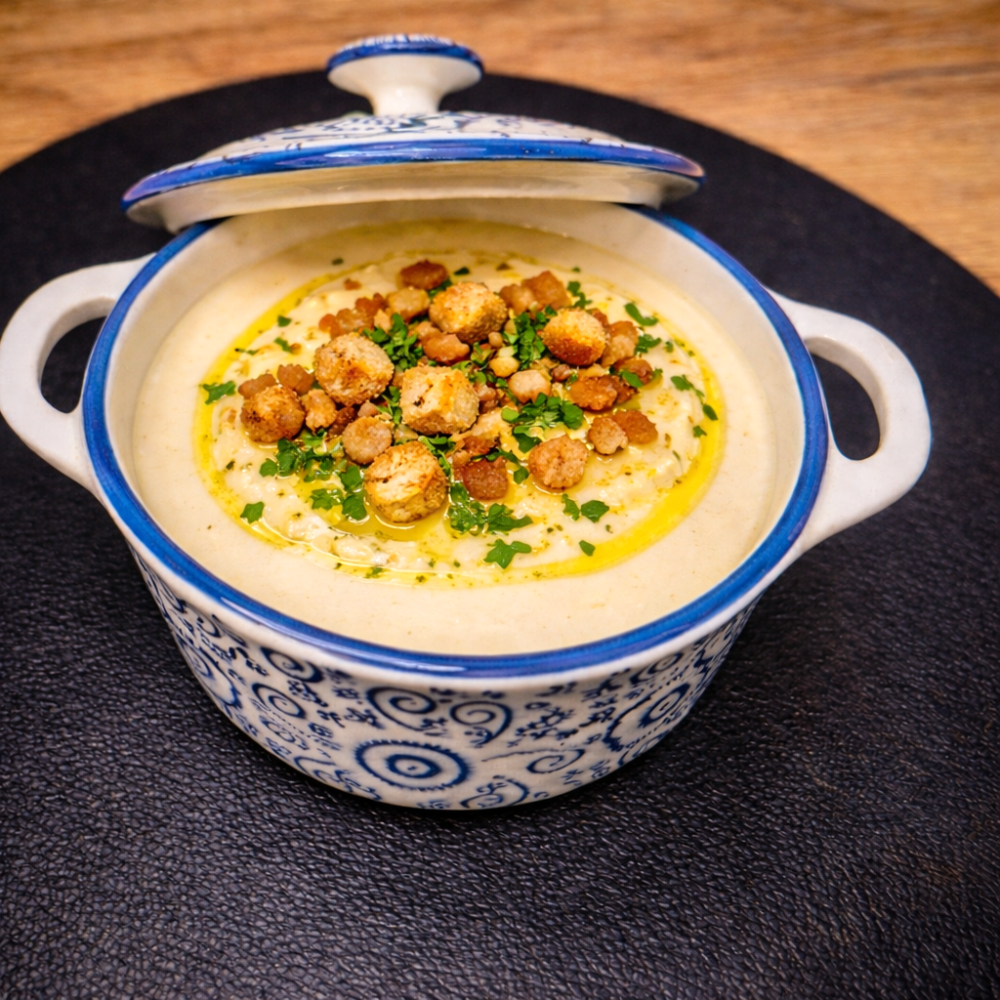 Supa cremă de țelină este pregătită pentru a obține o textură catifelată și un gust echilibrat de țelină, ideală ca aperitiv sau fel principal pentru o masă sănătoasă și savuroasă.
