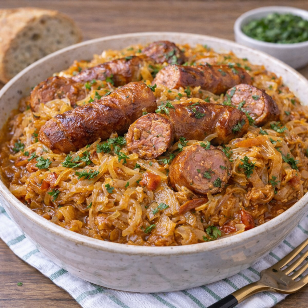 Varza dulce gătită cu cârnați fragedi și condimente atent alese creează un preparat bogat și savuros, perfect pentru mese tradiționale și ocazii speciale.